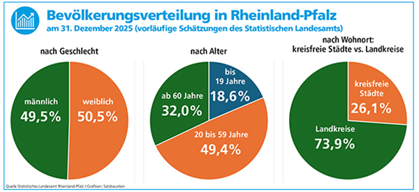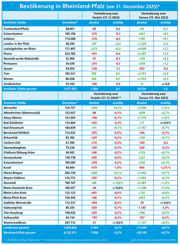 Nach Zunahmen in den Vorjahren sank die Bevölkerungszahl in Rheinland-Pfalz 2025 leicht. Zum Jahresende lebten nach einer vorläufigen Schätzung des Statistischen Landesamts 4.122.500 Menschen im Bundesland. Das waren 7.100 Personen oder 0,2 Prozent weniger als zwölf Monate zuvor. Anders als noch 2024 konnte das Geburtendefizit durch den Zuwanderungsüberschuss nicht ausgeglichen oder gar übertroffen werden.